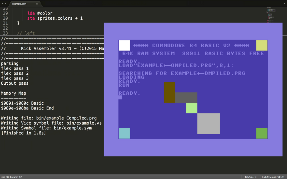 VIC-II the graphical chip of Commodore 64 can display eight movable bitmaps, also known as sprites. It is a feature designed specifically to use in games. Sprites can be controlled by the set of registers that are mapped directly onto the memory starting at the hexadecimal address $d000...